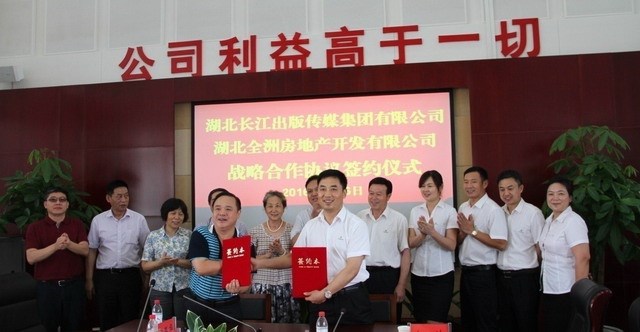 2016年8月6日下午,湖北全洲房地產開發有限公司與湖北長江出版傳媒集團(股份)有限公司簽署了戰略合作協議。湖北全洲集團孫芳洲、戴千、隋紅、曾慧萍、徐寶強、付彥平、李波橋、劉磊、李斌、趙坤到會,長江傳媒集團公司黨委書記、董事長潘啟勝,監事會主席宋丹娜,副總裁那拓祺、趙亞平,長江傳媒公司副總經理田武英、邱菊生,長江傳媒集團公司財務部部長羅明偉、資產管理部部長陳杰、戰投辦主任冷雪等嘉賓共同出席和見證了本次簽約儀式。